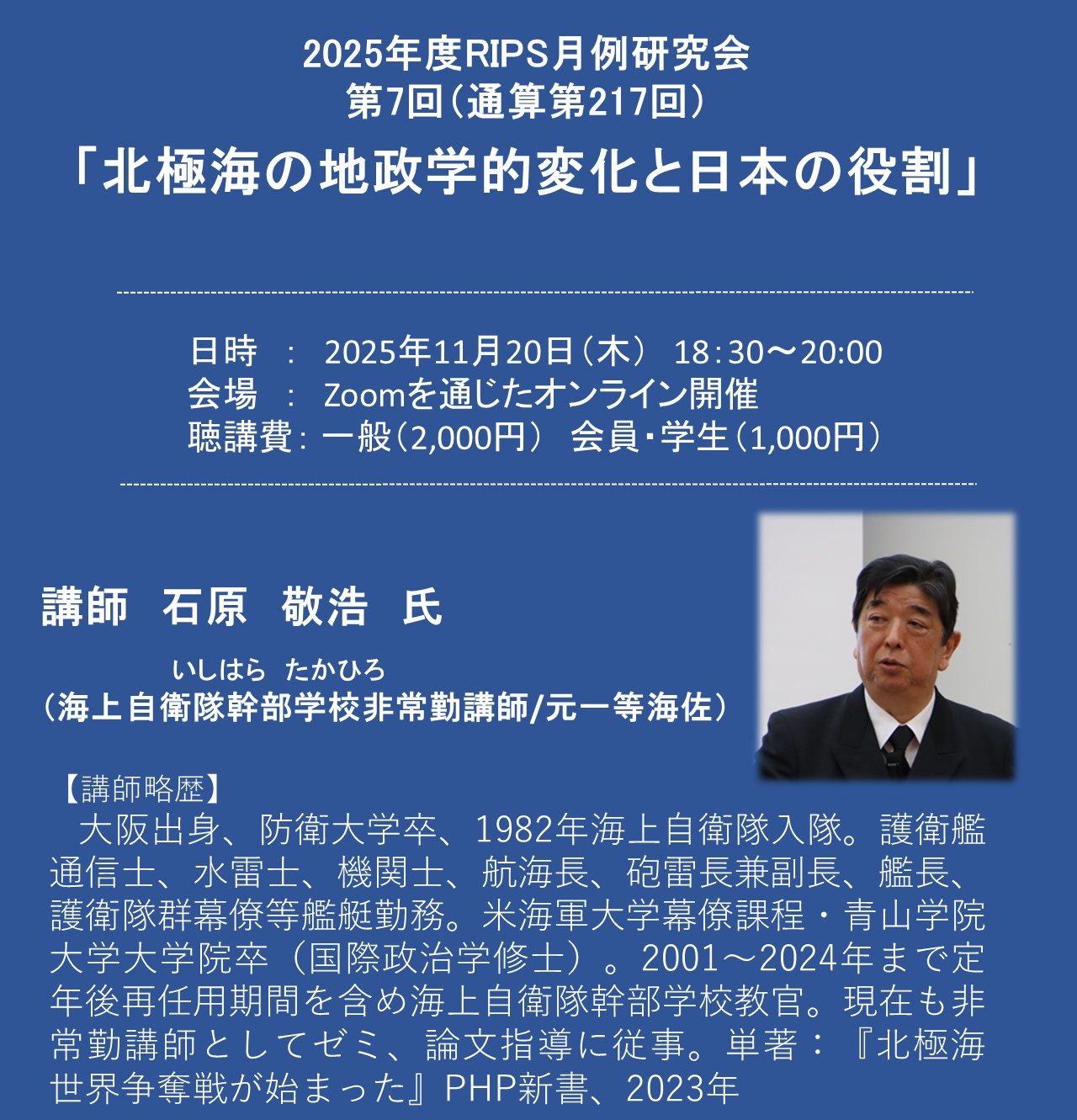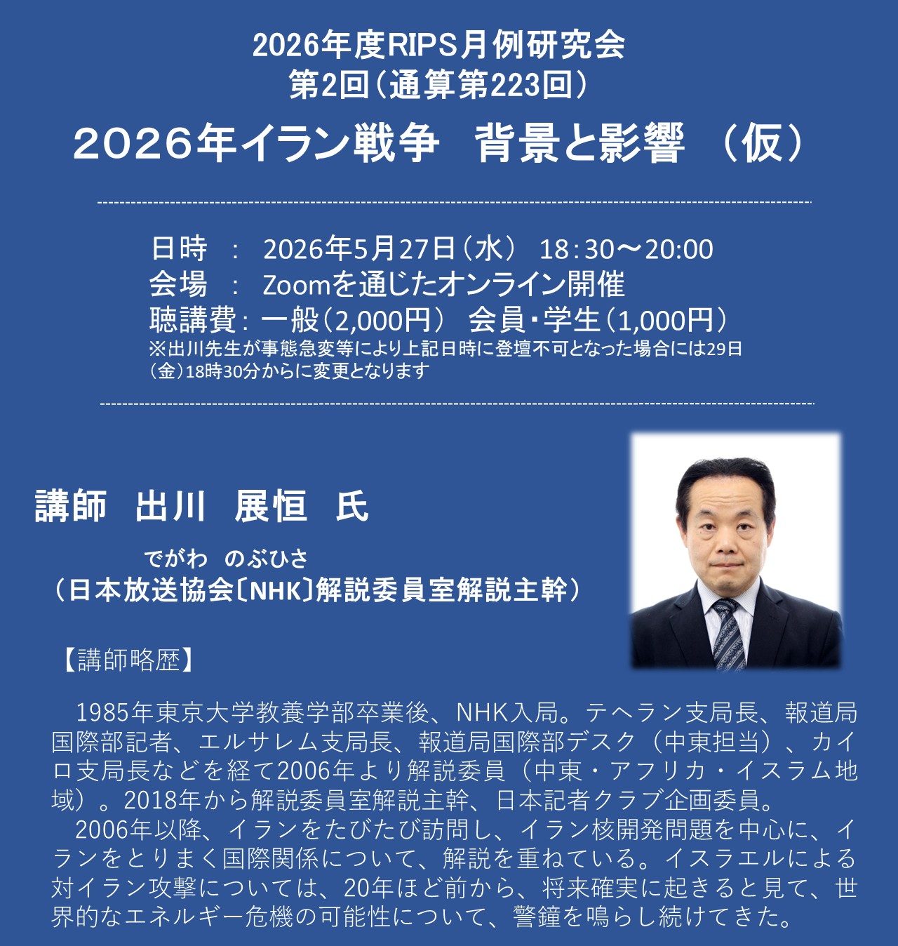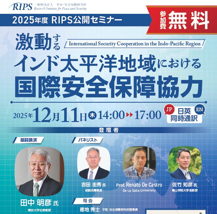 平和・安全保障研究所(RIPS)は、1978(昭和53)年、 猪木正道(元防衛大学校長)、高坂正尭(京都大学教授)などによって設立された独立のシンクタンクです。 調査研究、政策提言、イベント、人材育成、安全保障に関する知識の普及により 我が国の独立と安全に寄与しています。